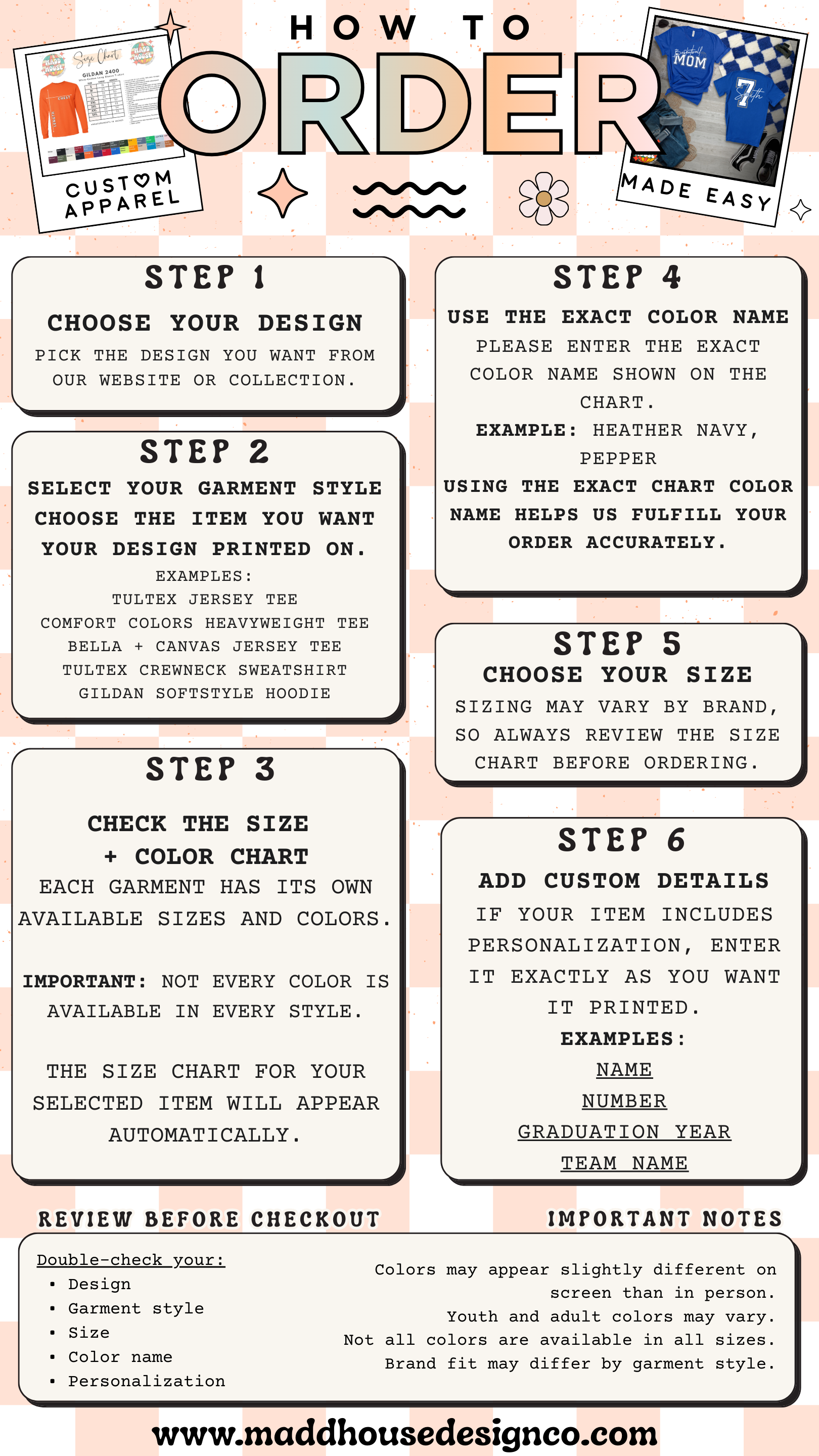 Color: Type the exact color name from the chart for your style! Want us to pick? No problem. Make sure to list at least 2 options you'd like, preferably 3. (If stock is limited, your 2nd or 3rd choice will be used.)